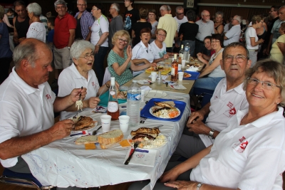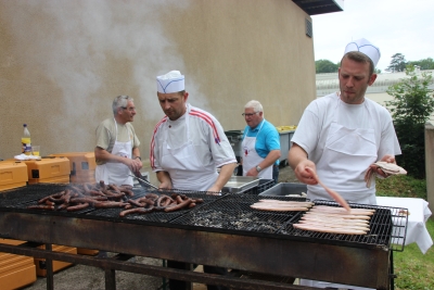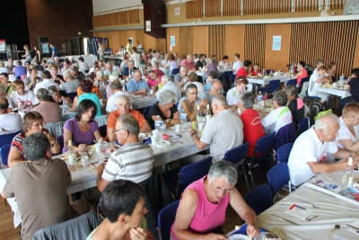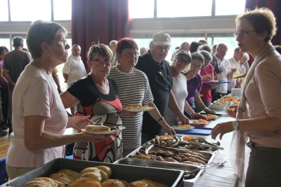 De retour vers 12 h 30, les premiers marcheurs sont allés reprendre des forces auprès des bénévoles s'occupant de l'apéritif puis ils se sont faufilés à travers la salle pour aller quérir la précieuse nourriture du jour : viande grillée au barbecue, salades diverses, fromages et l'un des deux desserts.